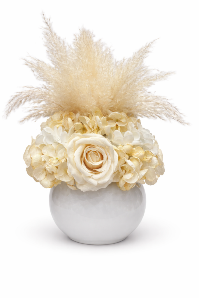 65,00 €Centrotavola con fiori artificiali, rose, ortensie e pampas in ampolla bianca Ø 25 cm