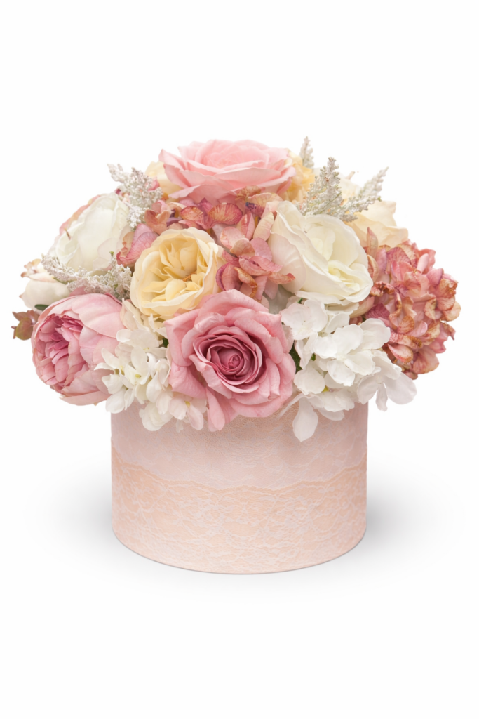 Box fiori artificiali profumati con mix di fiori rosa, panna e bianchi Ø 30