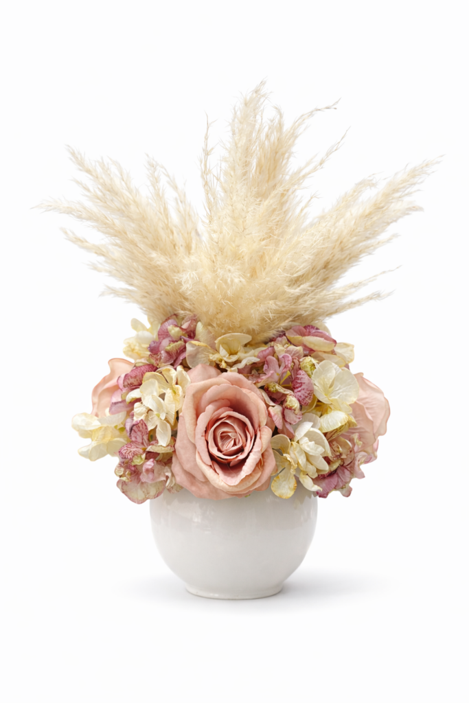 35,00 €Centrotavola con fiori artificiali, rose, ortensie e pampas in ampolla bianca Ø 25 cm
