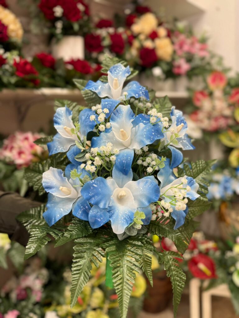 65,00 €Fiori artificiali per cimitero mazzo con sette catleya in vetroresina blu