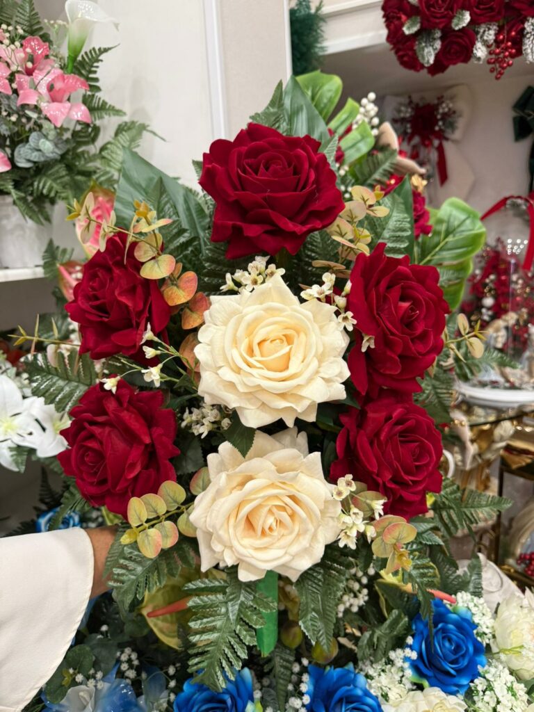 Fiori artificiali per cimitero mazzo con sette rose rosse in velluto, cinque rosse e due beige