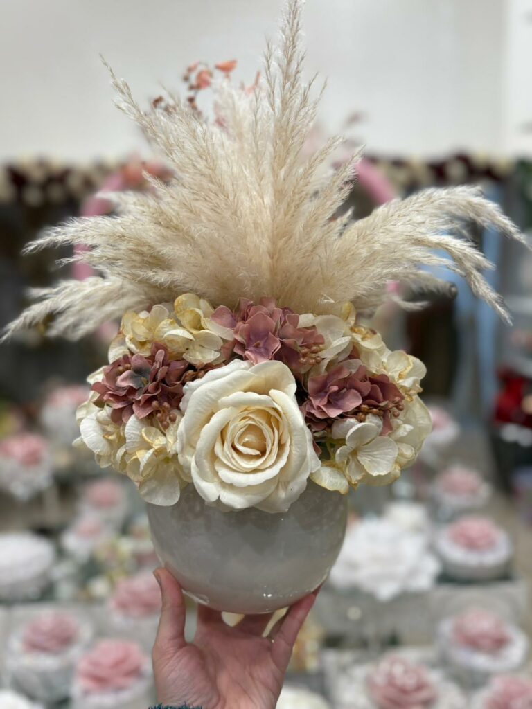 Centrotavola con vaso in ceramica fiori artificiali composto da rose panna, ortensie e rami di pampas Ø 25 cm