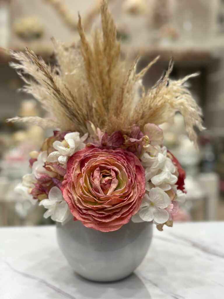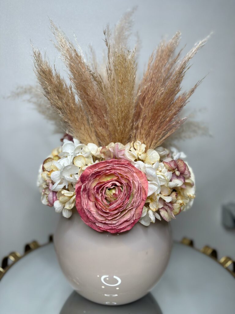 Centrotavola con fiori artificiali composto da ranuncoli panna e rosa e rami di pampas Ø 33