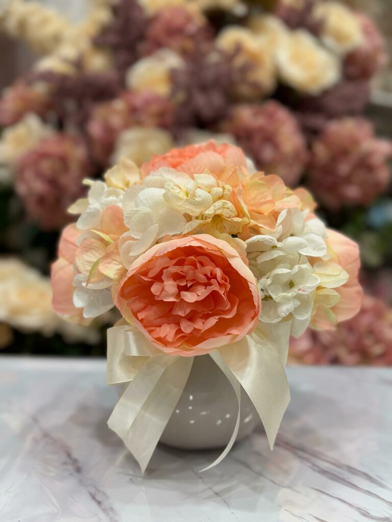 Centrotavola con fiori artificiali composto da rose in velluto panna, ortensie e rami di pampas Ø 33