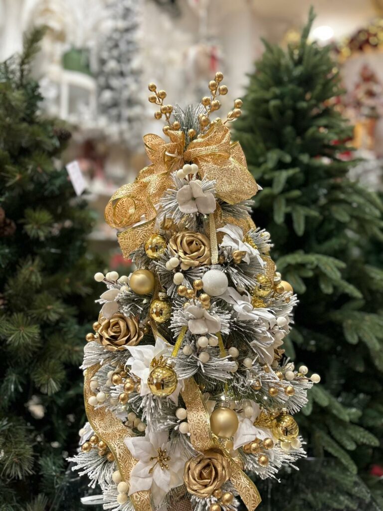 ALBERELLO NATALE INNEVATO CON DECORAZIONI ORO, E BIANCHE h cm 70