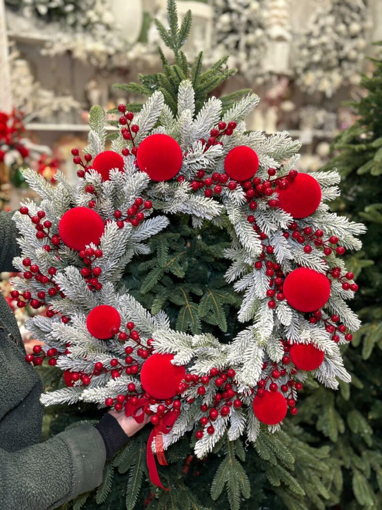GHIRLANDA NATALIZIA CON PALLINE DI NATALE IN VELLUTO ROSSE E BACCHE Ø 55