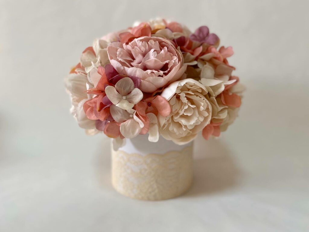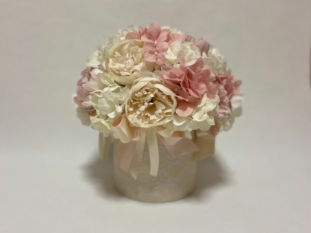 Cappelliera decorata con merletto peonie dalie e ortensie COLORE: avorio, rosa cipria