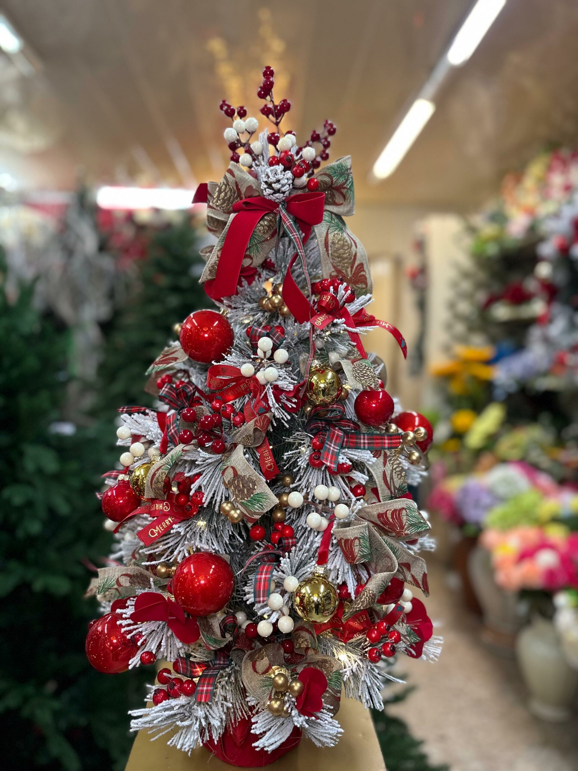 ALBERELLO NATALE INNEVATO CON DECORAZIONI ROSSE, ORO E SCOZZOSE h cm 70