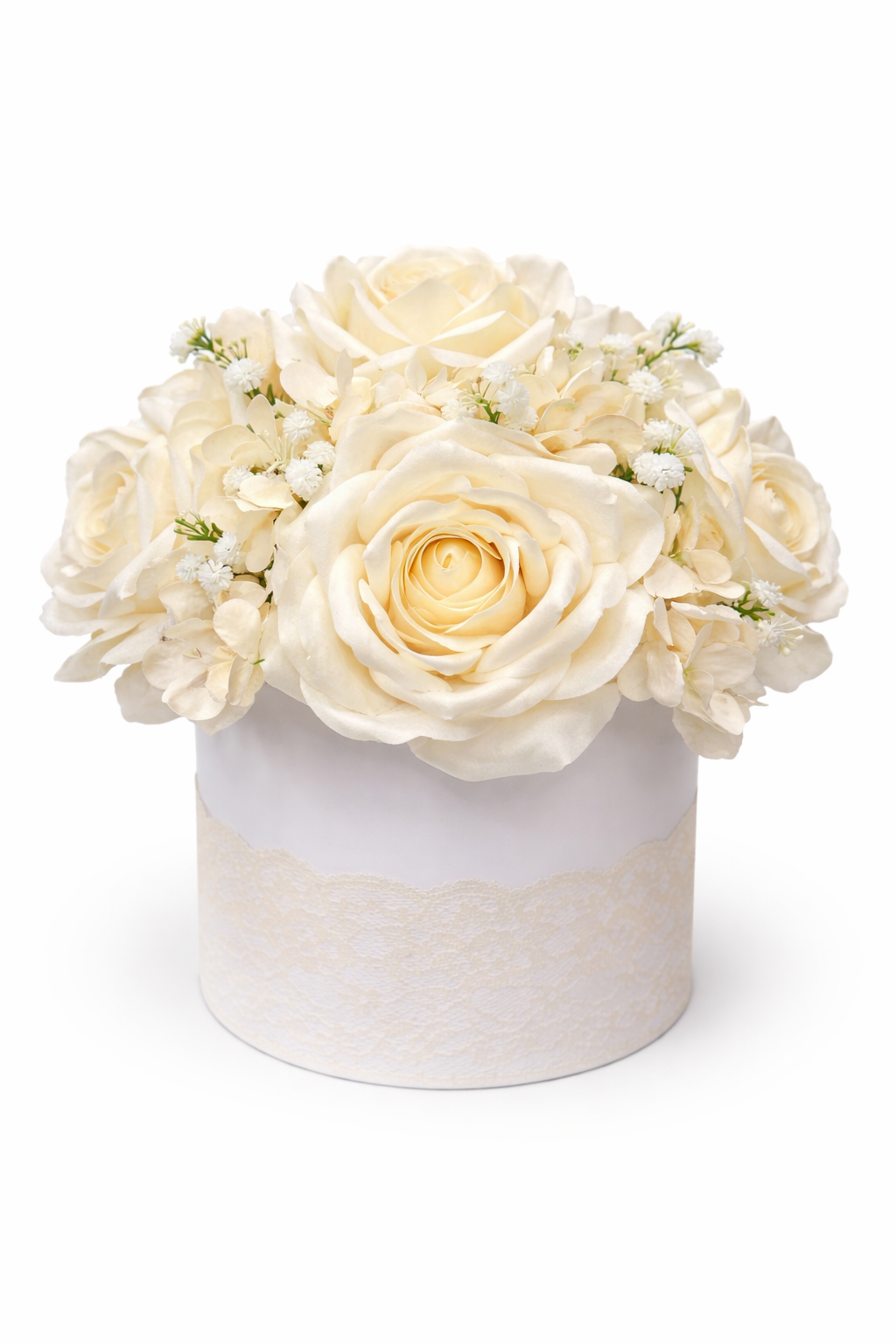 Box fiori artificiali profumati con rose,ortensie panna e gypsophila– Flower box elegante Ø 30