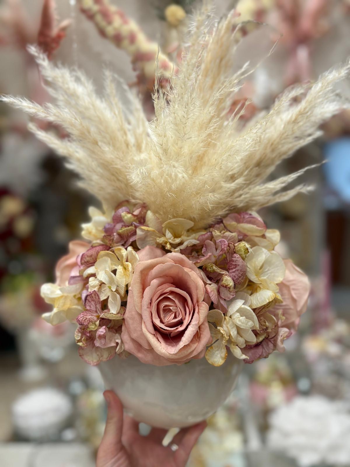 Centrotavola, ampolla con fiori artificiali composto da rose in velluto , ortensie e pampas Ø 25 cm