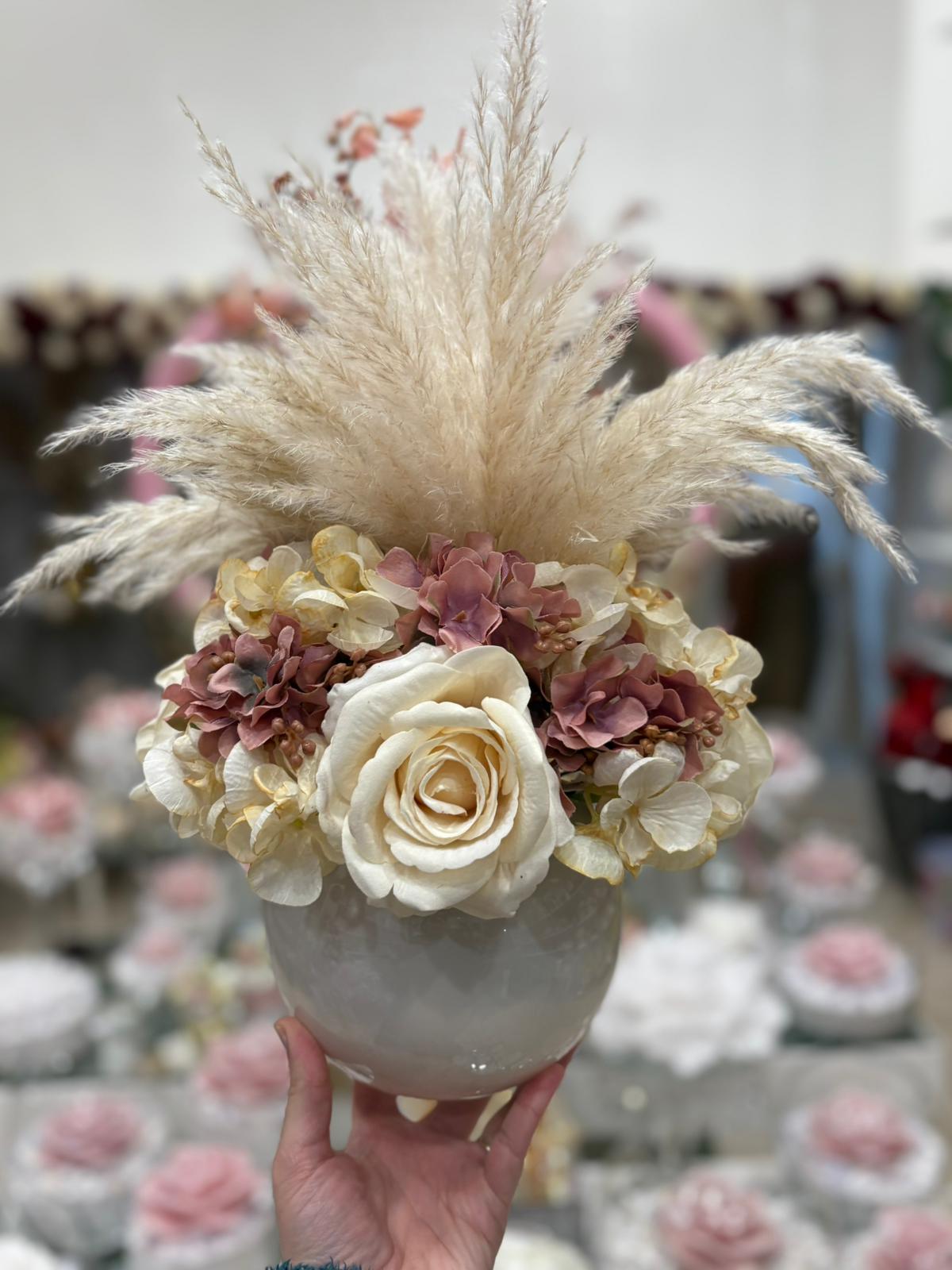 Centrotavola con fiori artificiali tondo con ampolla in in vetro, composto da 4 rose panna in velluto, rami di pampas naturali e ortensie panna e rosa antico.