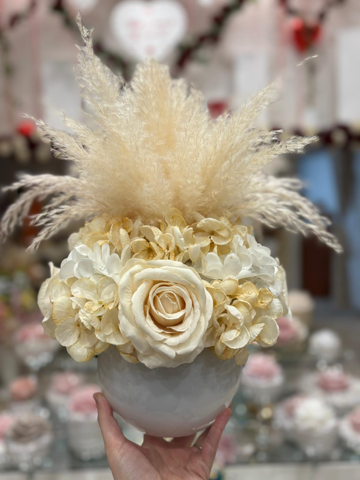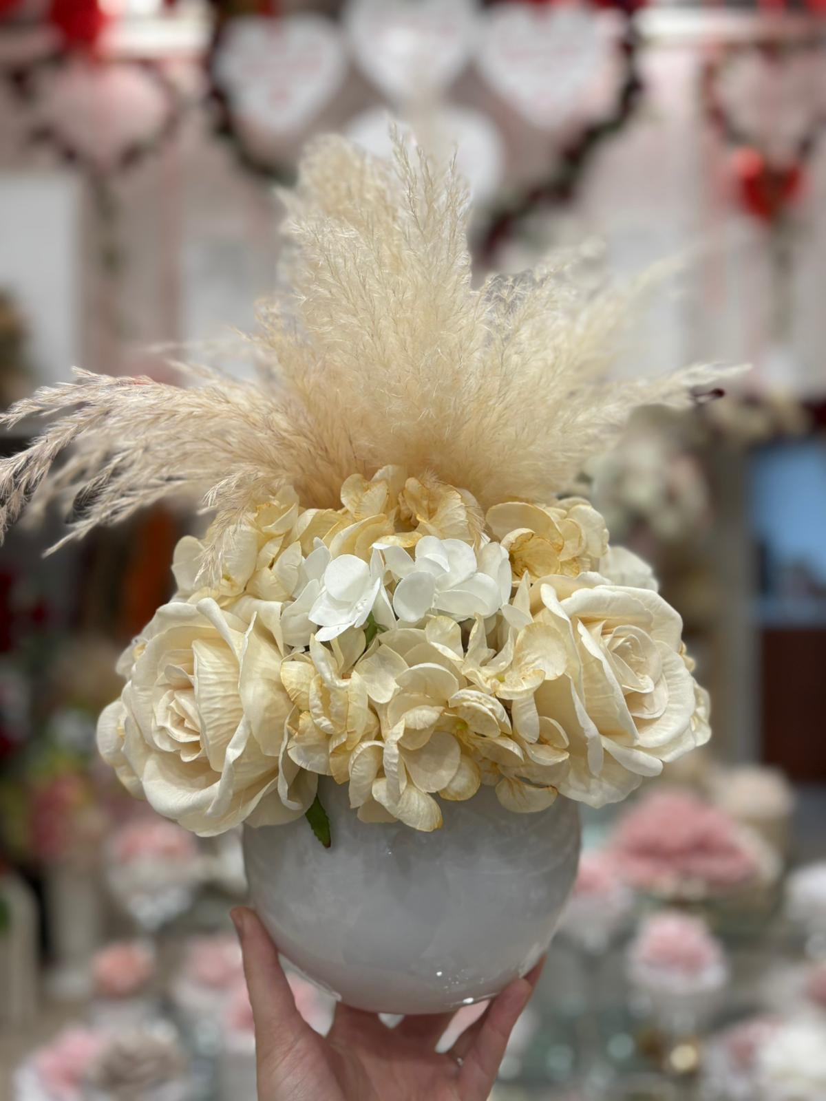 Centrotavola con fiori artificiali tondo con ampolla in vetro bianca, composto da rose simil velluto, rami di pampas naturali e ortensie di diverso colore.