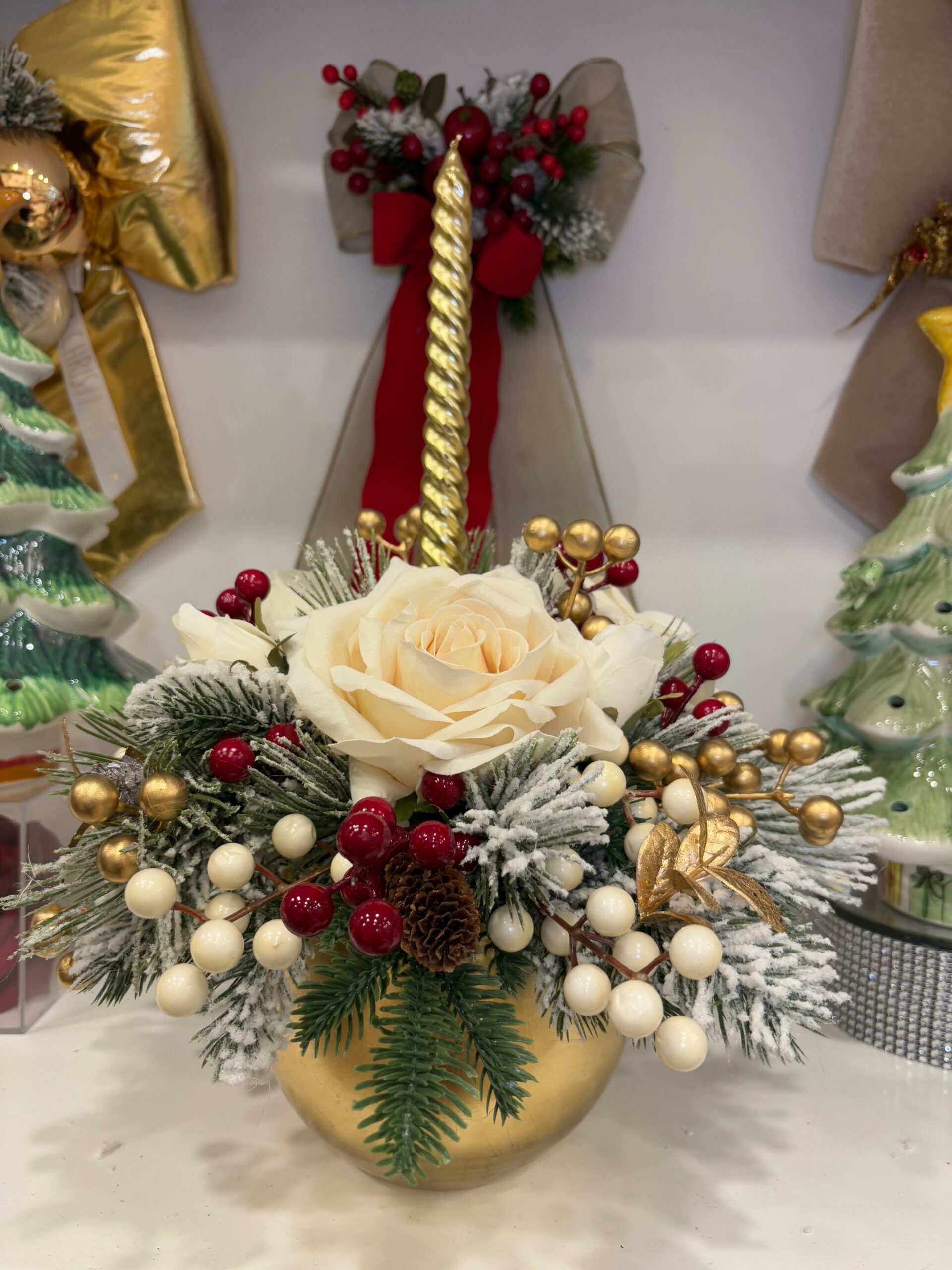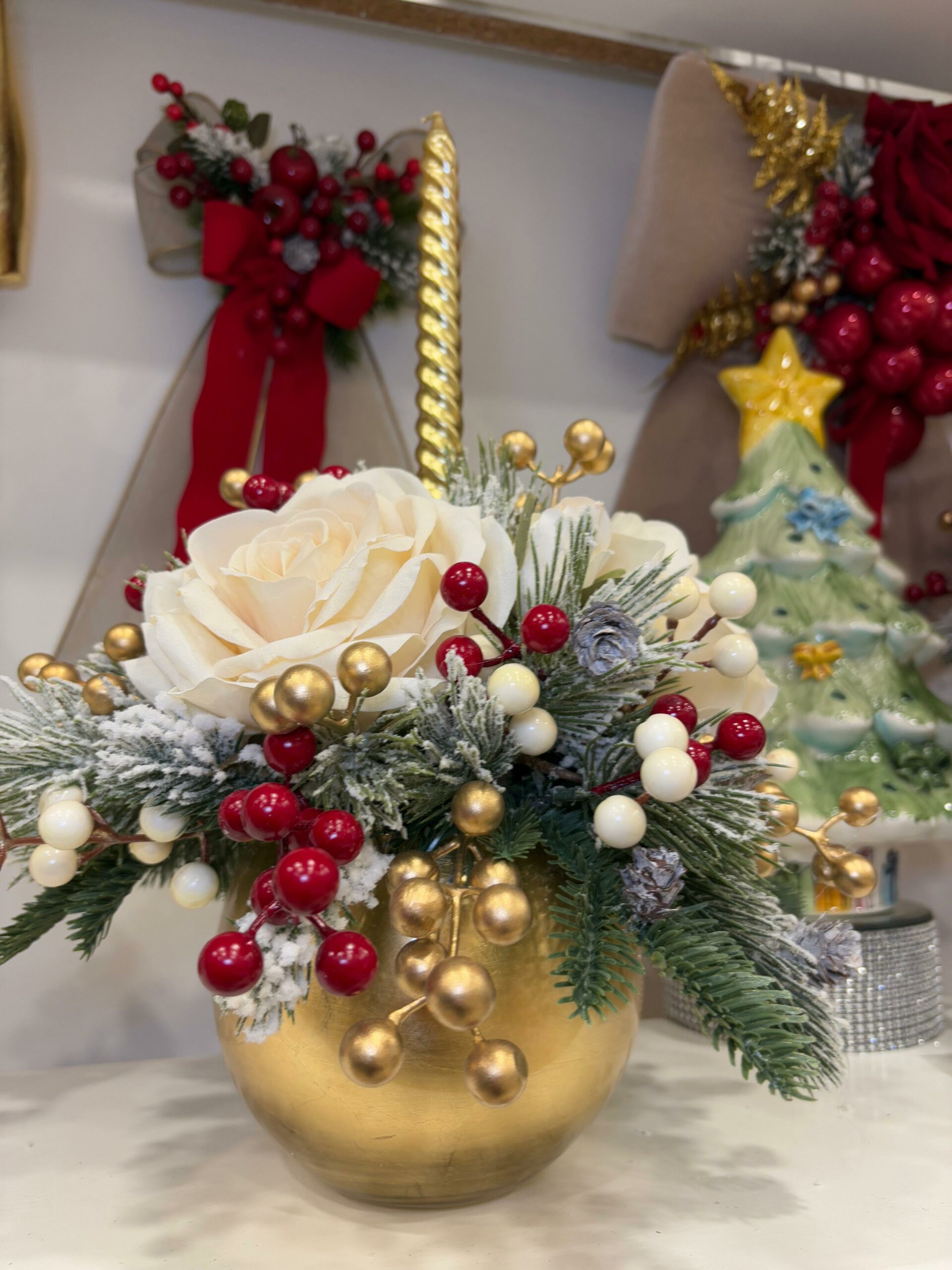 Centrotavola natalizio in ampolla di vetro oro, composto da tre eleganti rose in velluto panna, una candela oro, abete, bacche, rami, decorazioni natalizie ed eleganti nastri.
