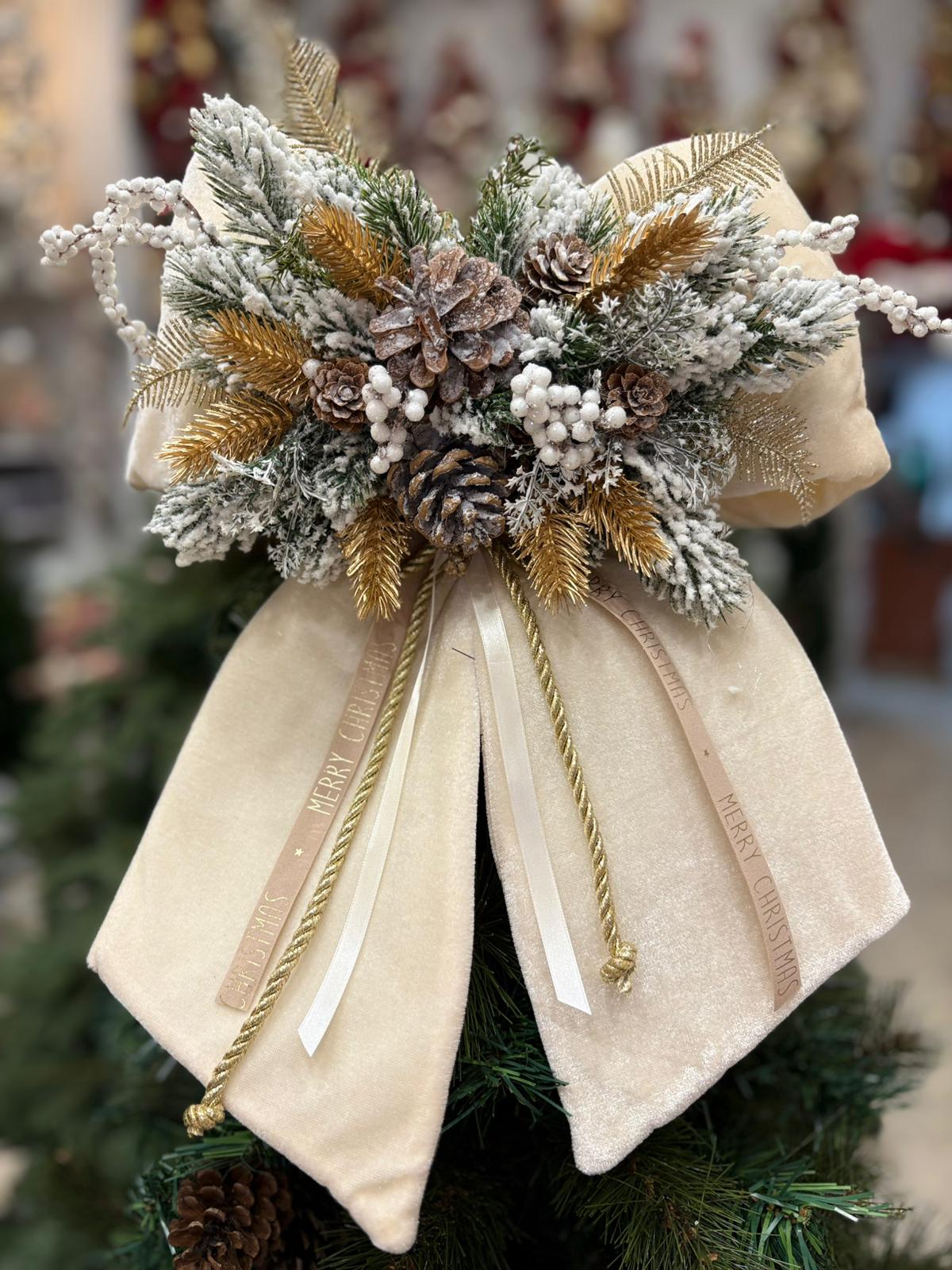 Fiocco natalizio panna in velluto con  eleganti decorazioni, composto da pigne, rami di abete, bacche natalizie ed eleganti nastri.