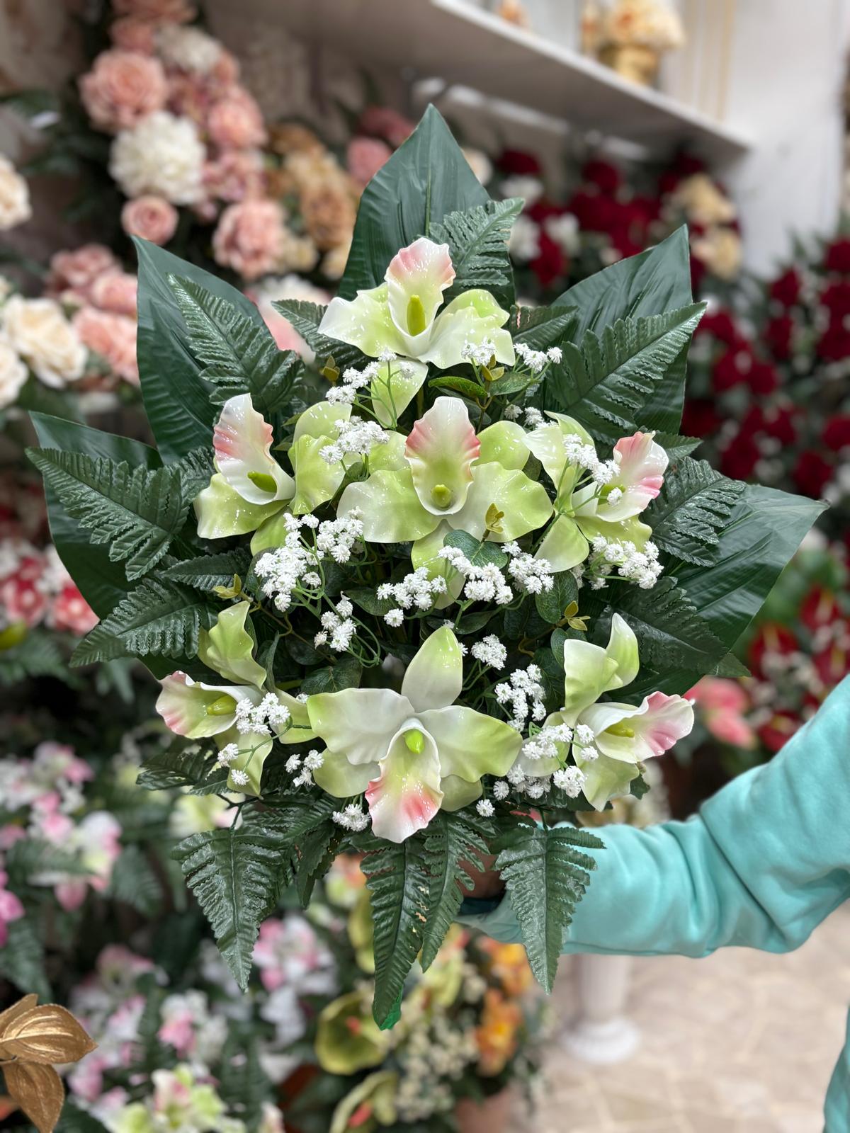 Mazzo con fiori artificiali per cimitero realizzato con  7 eleganti Catleya in vetroresina verde chiaro con delicate sfumature rosa, arricchito con gypsophila bianca, erba decorativa, foglie di felce foglie posteriori eleganti che donano alla composizione un aspetto armonioso e raffinato.