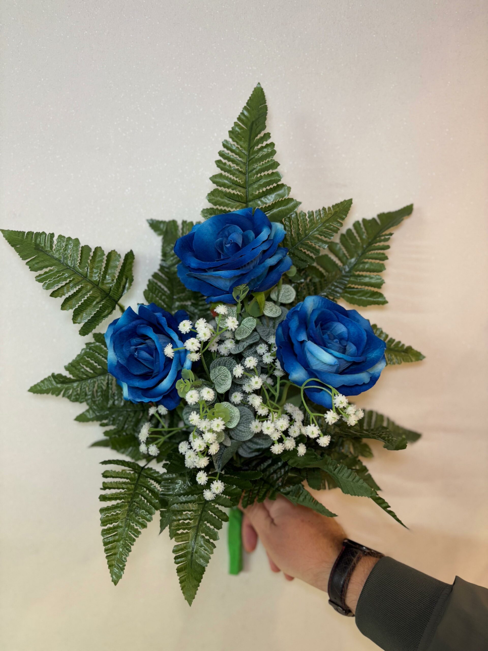 Mazzo con fiori artificiali per cimitero realizzato con tre boccioli di rose blu con sfumature simil velluto,  erba eucalipto, foglie di felce e gypsophila. Le nostre composizioni per loculi sono realizzate curando ogni minimo dettaglio, con fiori artificiali di alta qualità, simili al naturale, destinati a durare nel tempo.