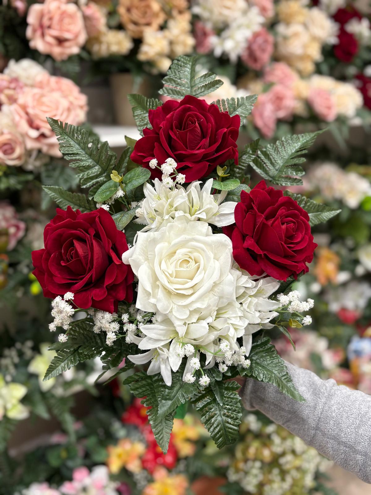 Mazzo con fiori artificiali per cimitero realizzato con tre rose  rosse in velluto, una rosa bianca in velluto,  erba eucalipto, foglie di felce, fiorellini bianchi e  gypsophila. Le nostre composizioni per loculi sono realizzate curando ogni minimo dettaglio, con fiori artificiali di alta qualità, simili al naturale, destinati a durare nel tempo.