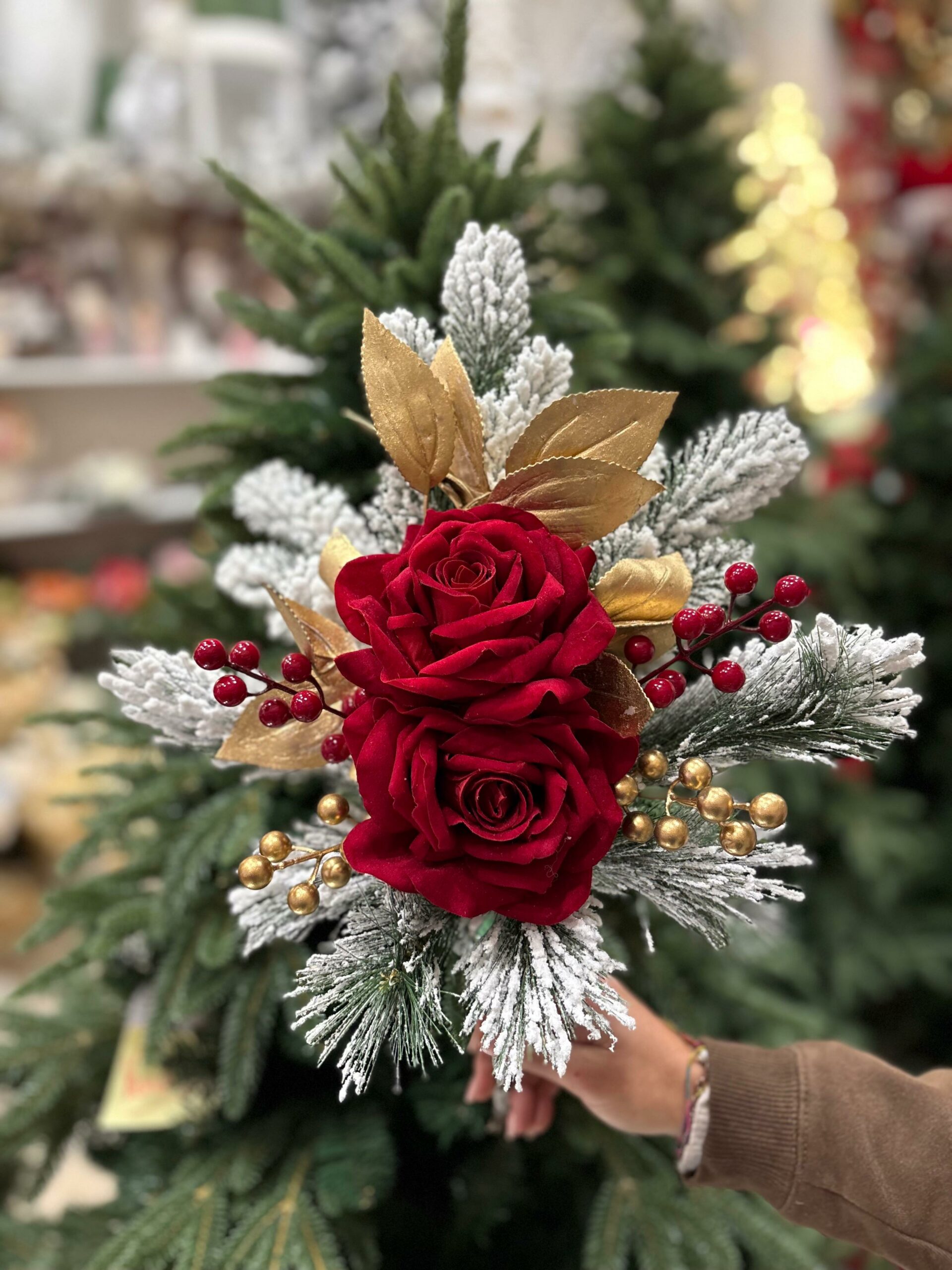 Fiori artificiali per cimitero mazzo natalizio con rami di abete, foglie oro e rose rosse in velluto