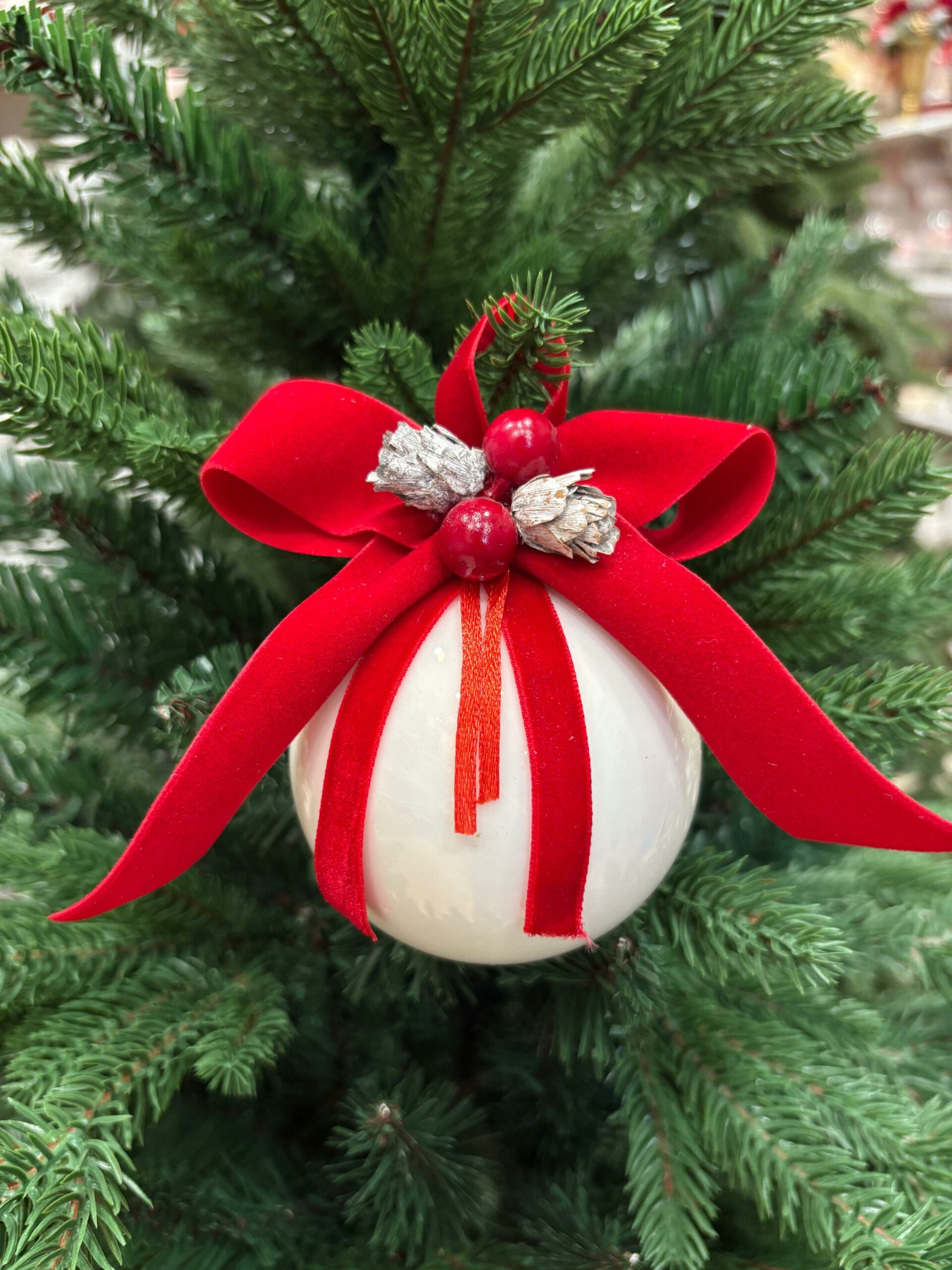 Pallina di Natale in vetro bianca con fiocco rosso in velluto e pistilli natalizi.