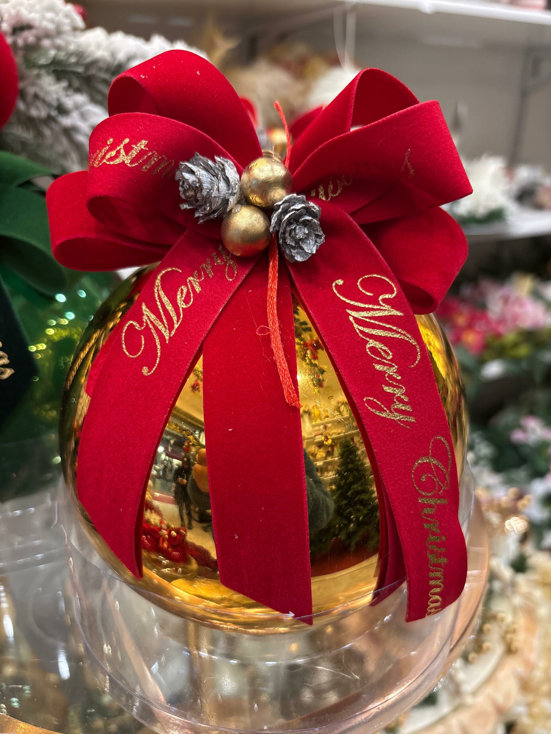 Pallina di Natale in vetro oro con fiocco rosso scritta Merry Christmas, pigne e pistilli natalizi.