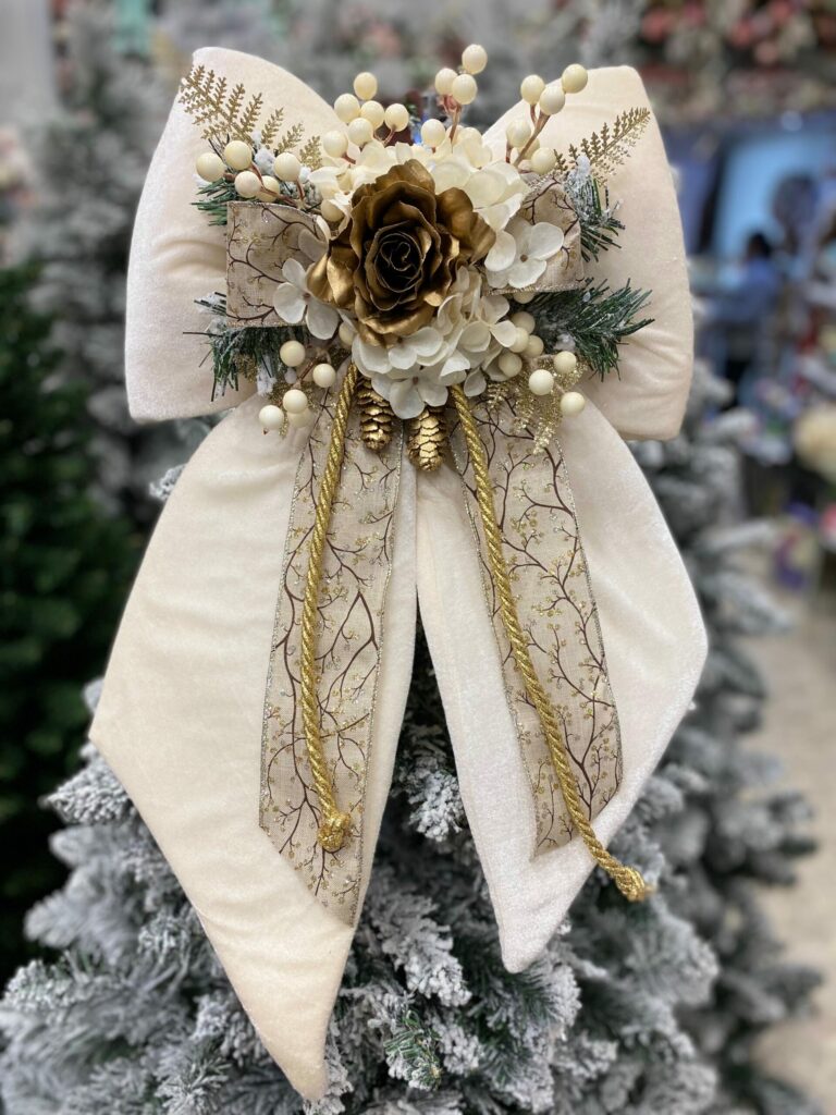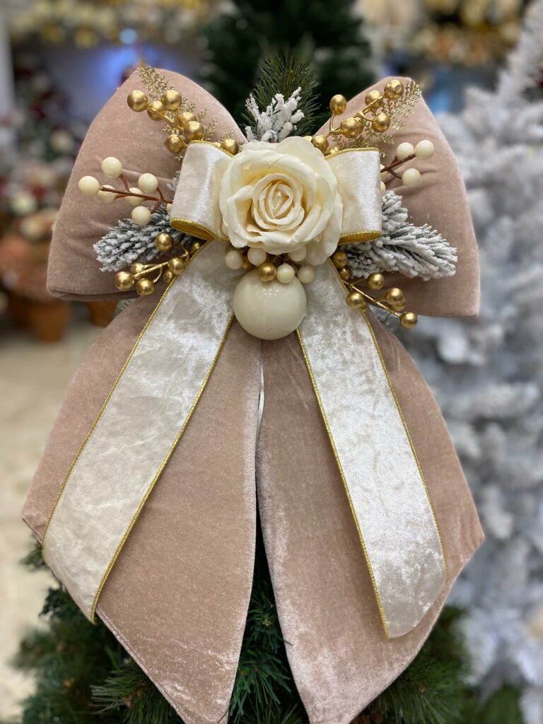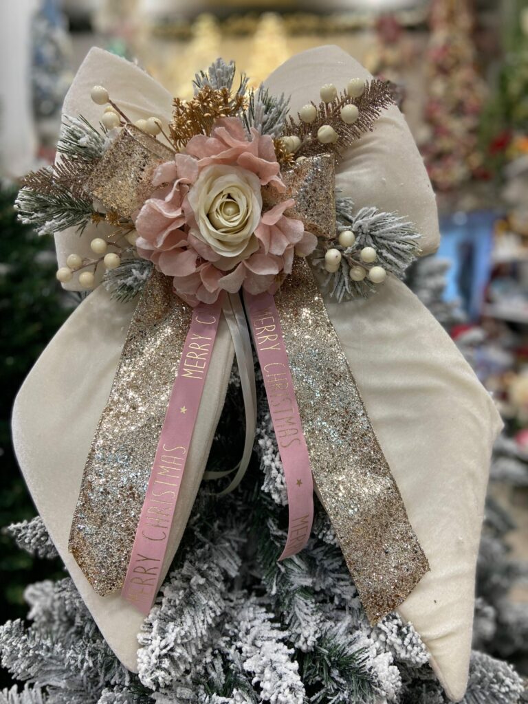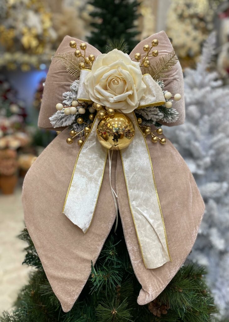 FIOCCO NATALIZIO IN VELLUTO PANNA CON CON ROSA ORO E DECORI cm 60
