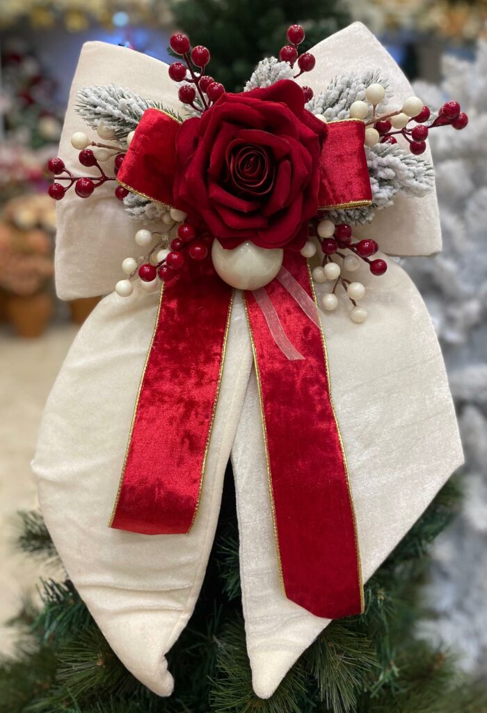 FIOCCO NATALIZIO IN VELLUTO PANNA CON ROSA ROSSA E DECORI cm 60