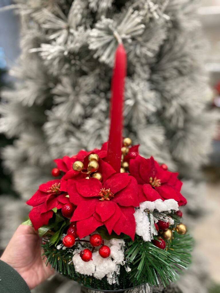 Centrotavola natalizio tondo con mini stelle natalizie rosse in velluto e decori