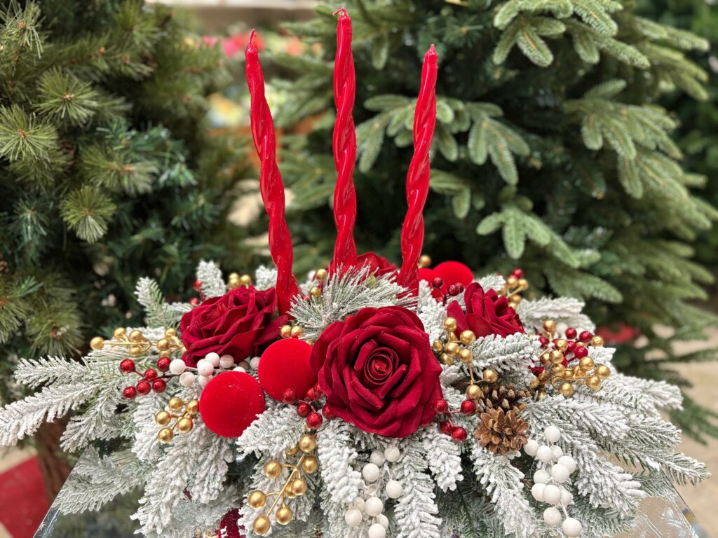Centrotavola natalizio composto da rose rosse, palline in velluto bacche e tre candele cm 70 cm
