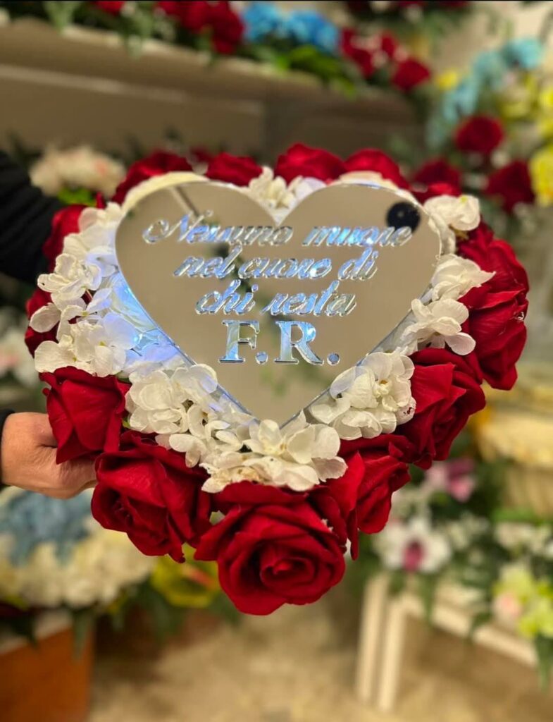 Cuore Floreale, Rose Rosse e Ortensie con dedica – Composizione per Cimitero