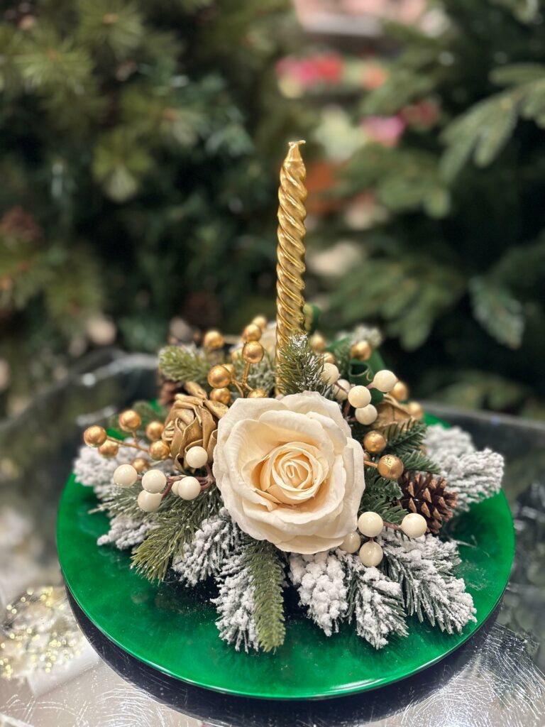 Centrotavola natalizio tondo con rose panna in velluto, pigne, bacche e decori Ø 30 cm