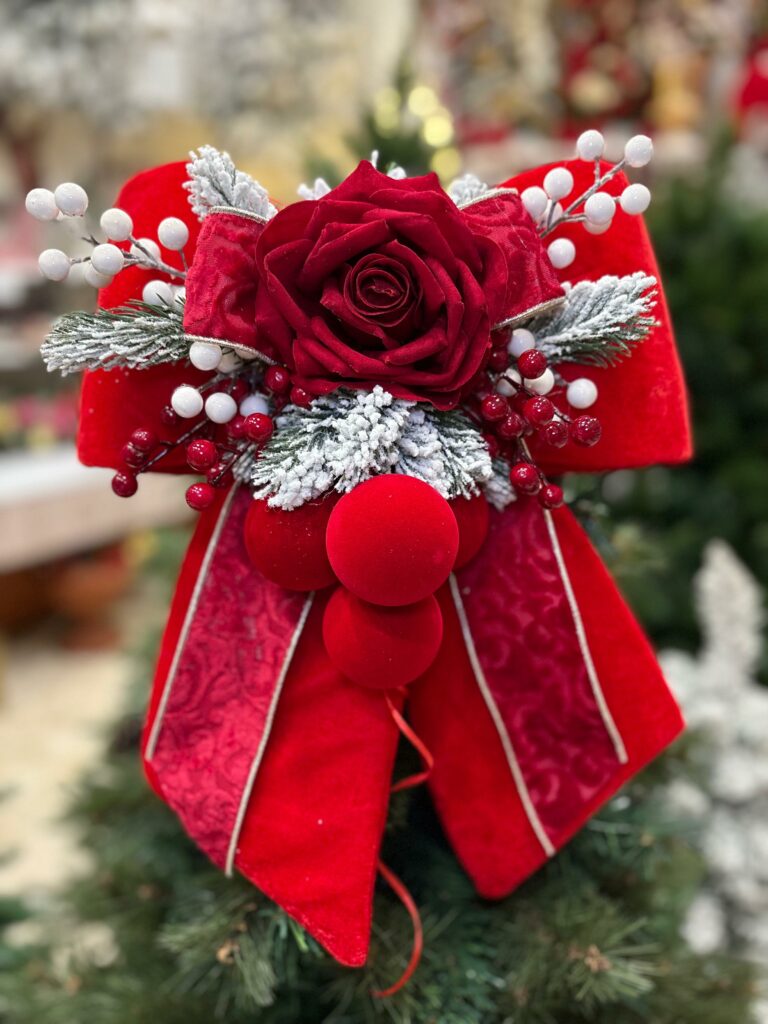 FIOCCO NATALIZIO IN VELLUTO ROSSO CON ROSA IN VELLUTO ROSSA, PALLINE IN VELLUTO E DECORI h cm 40