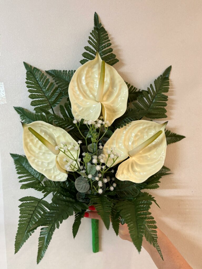 Fiori artificiali per cimitero mazzo con tre anthurium bianchi