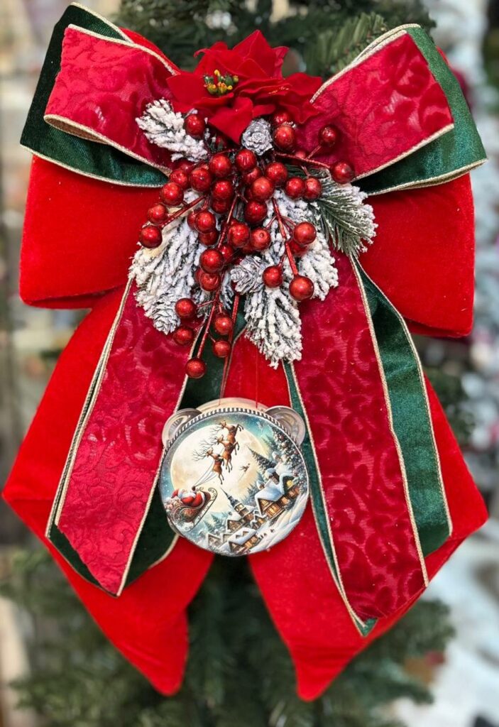 FIOCCO NATALIZIO IN VELLUTO ROSSO CON NASTRI IN VELLUTO VERDI E ROSSI, TAMBURELLA E DECORI cm 60