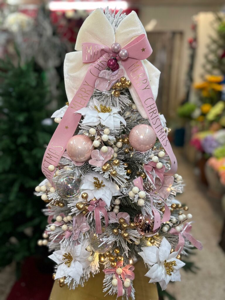 ALBERELLO NATALE INNEVATO CON DECORAZIONI ROSA, ORO, PANNA E ORO h cm 70