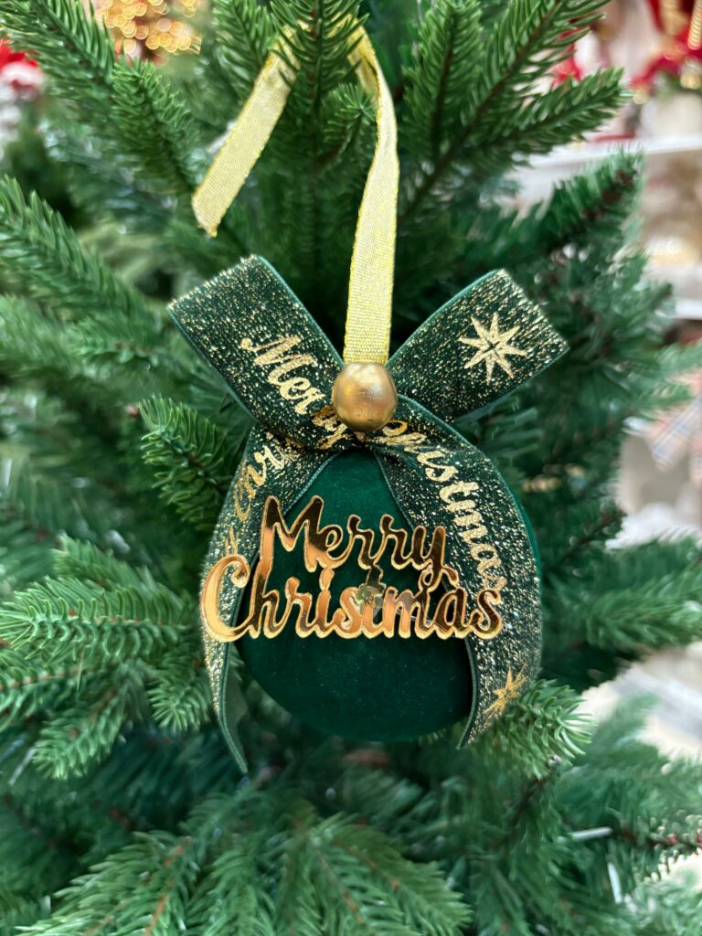 Pallina di Natale in velluto verde con fiocco, decorazioni e scritta Merry Christmas Ø 8 cm