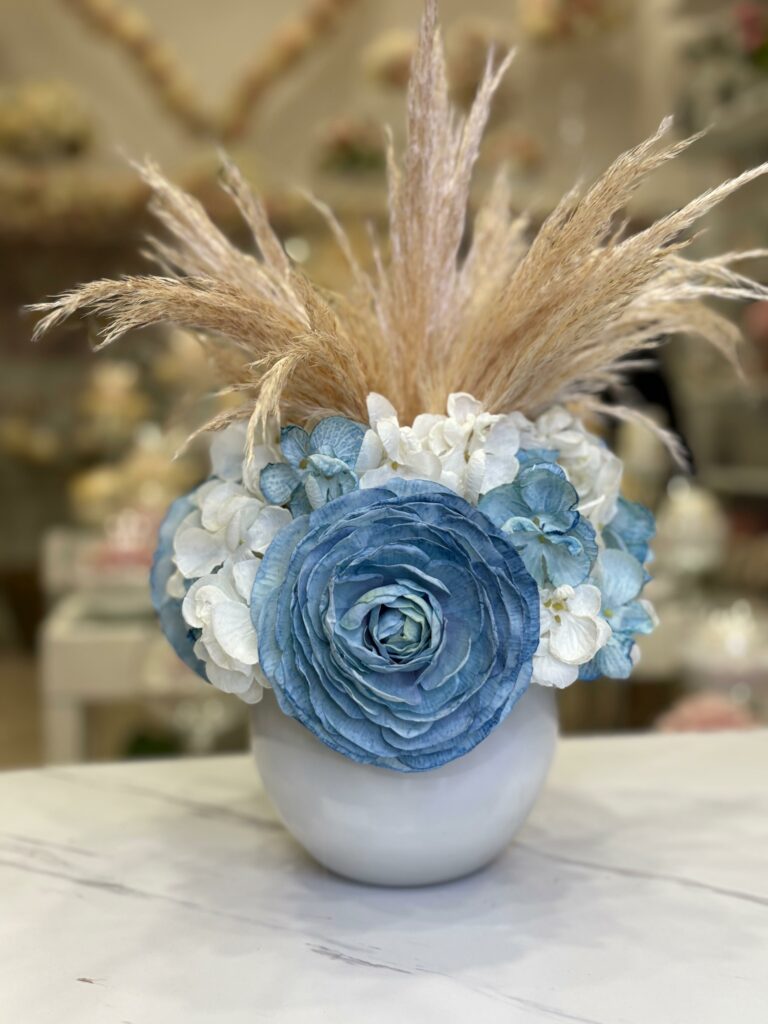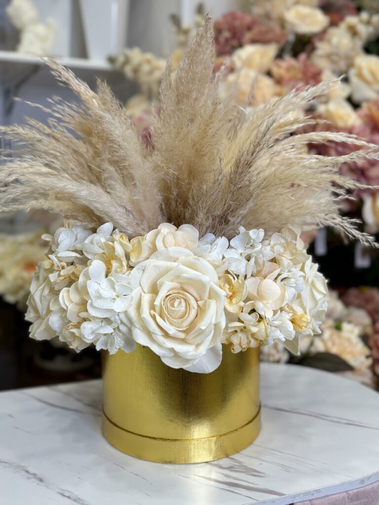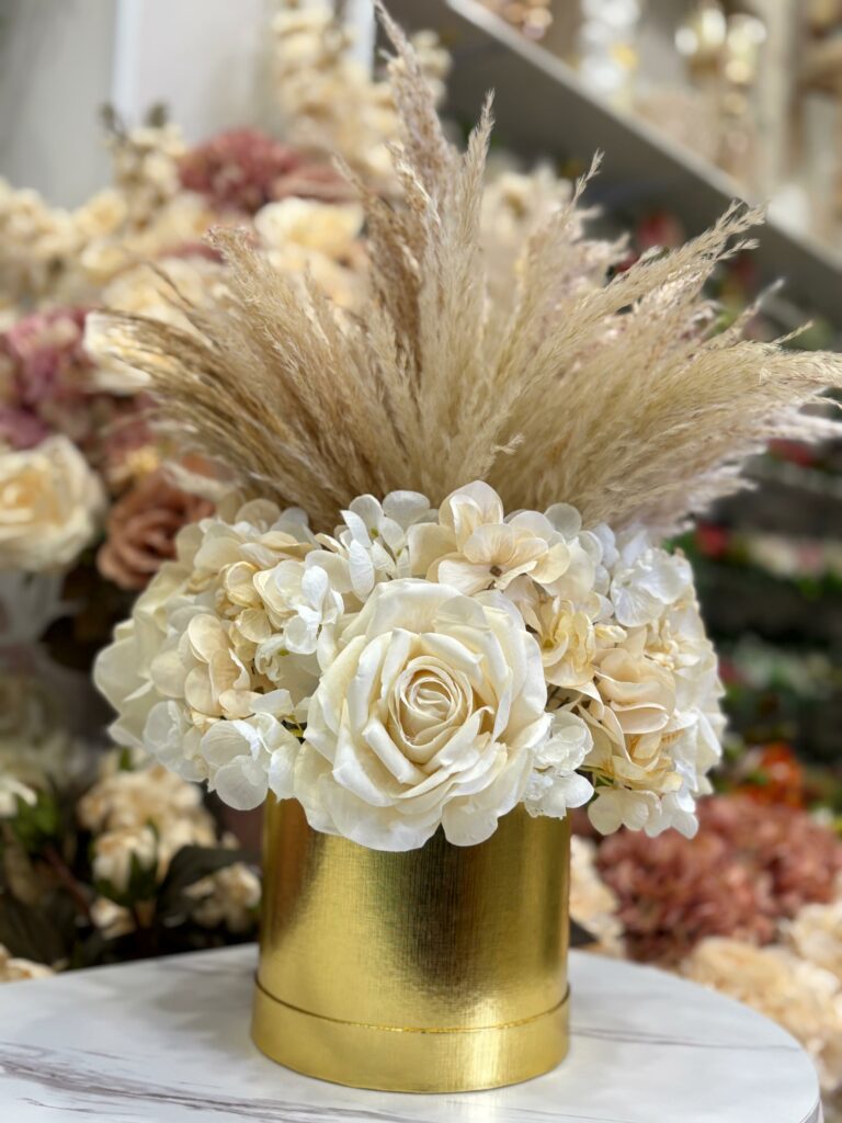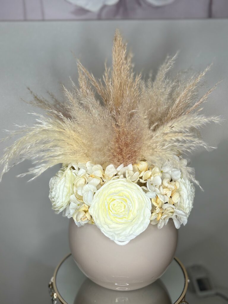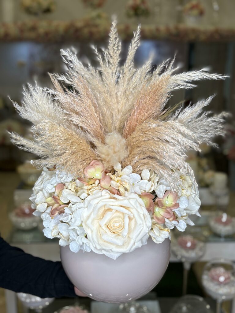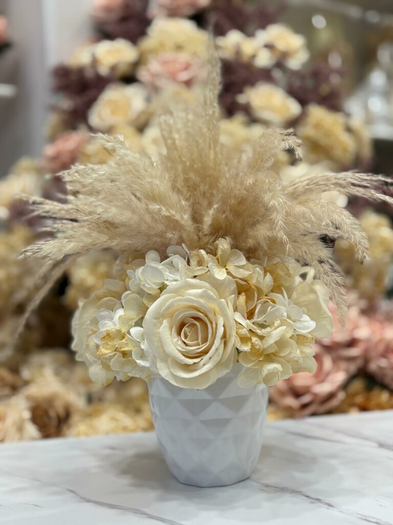 Centrotavola con fiori artificiali composto da rose in velluto panna, ortensie e rami di pampas Ø 33