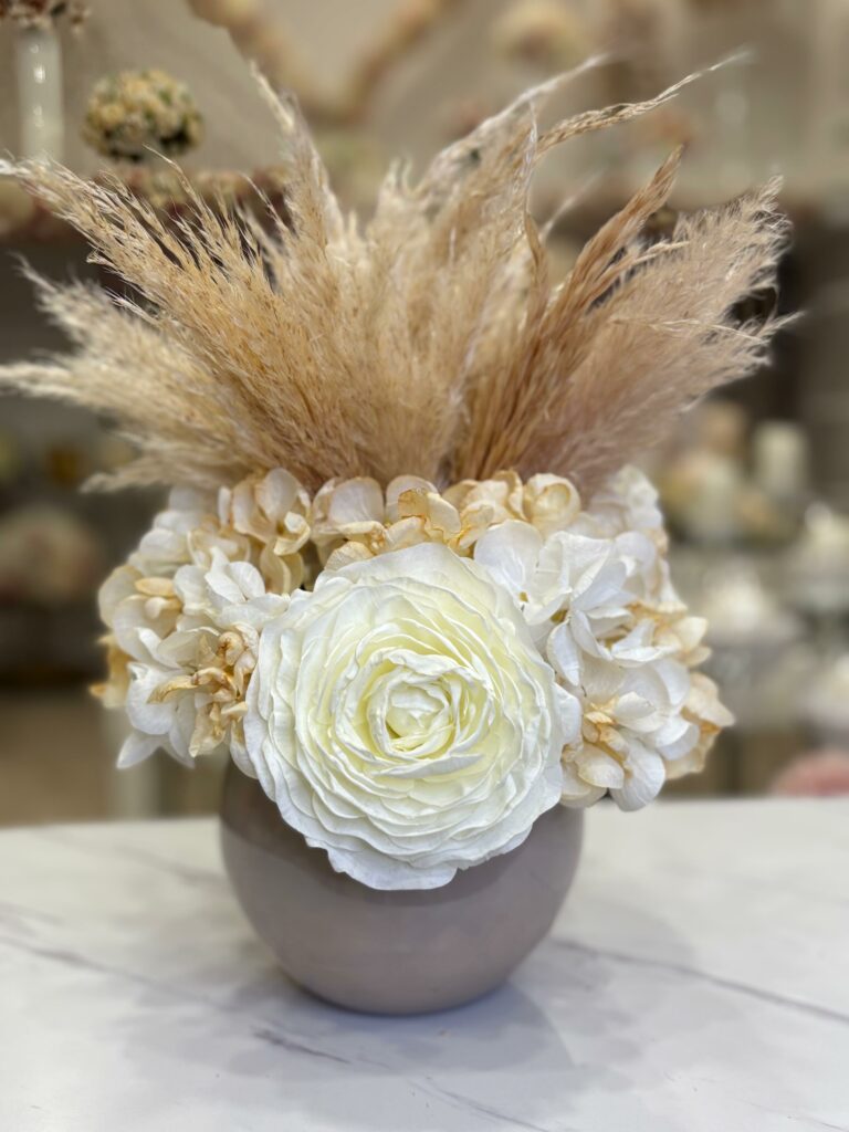 Centrotavola con fiori artificiali composto da ranuncoli panna, ortensie e rami di pampas Ø 33