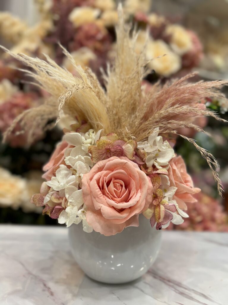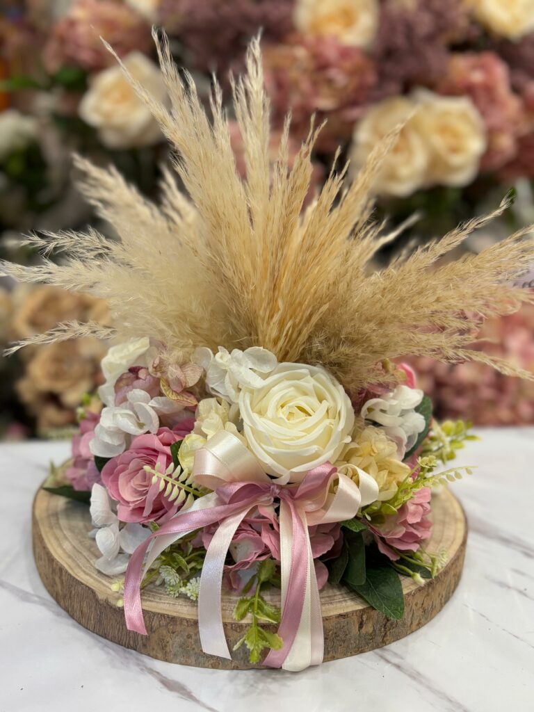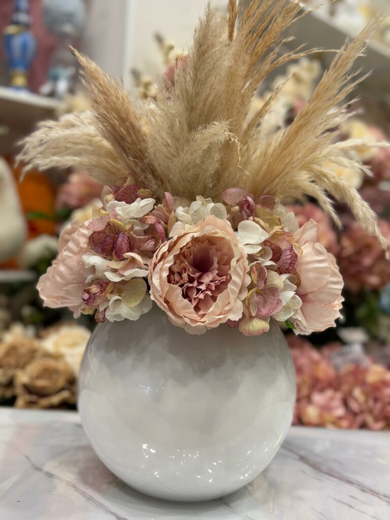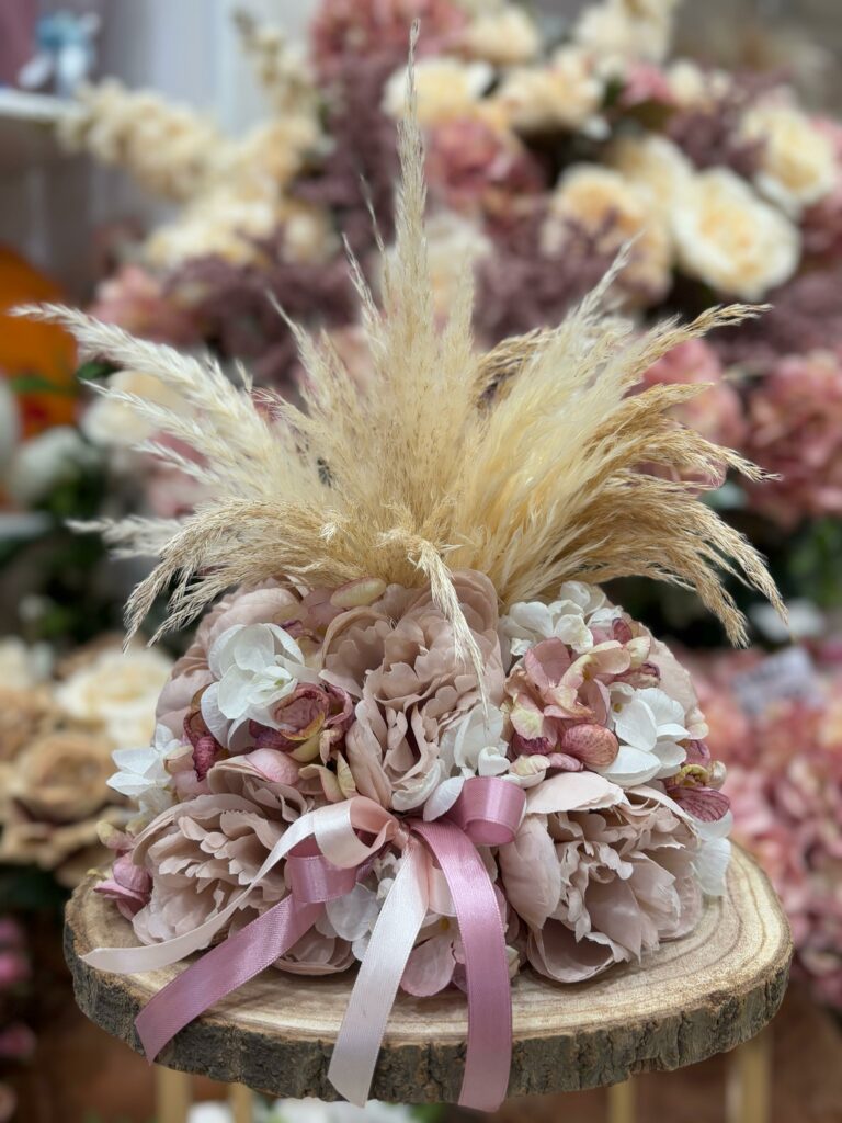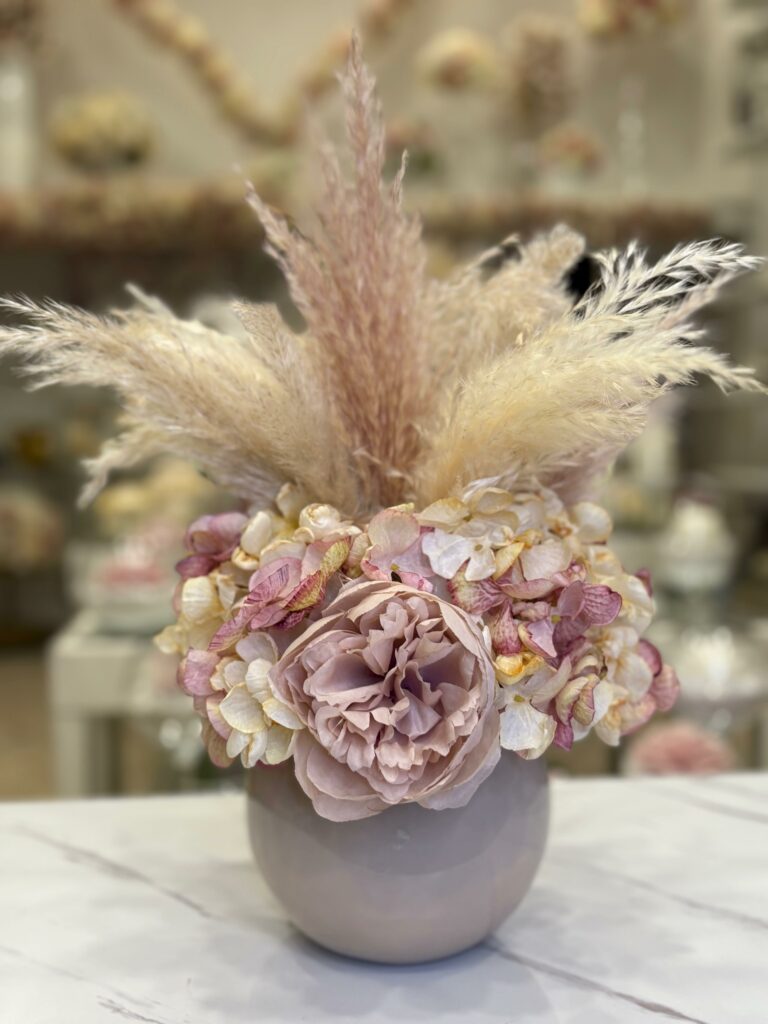 Centrotavola con fiori artificiali da peonie rosa, ortensie e rami di pampas Ø 33